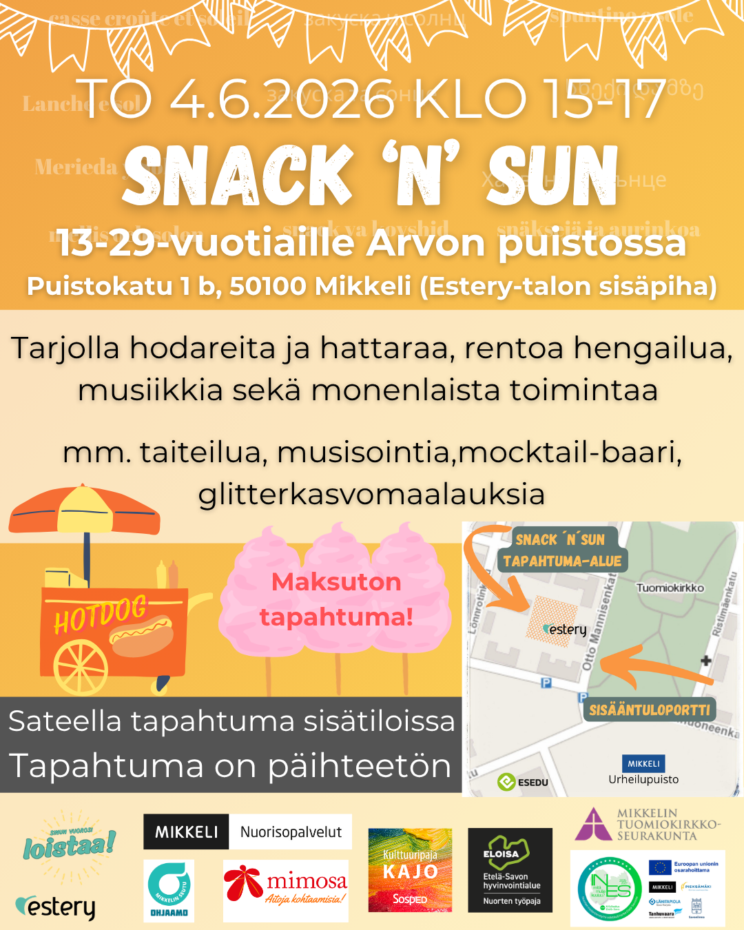 Nuorille (n. 13-29v.) suunnattu Snack'n Sun torstaina 4.6. klo 15-17 Arvon puistossa.