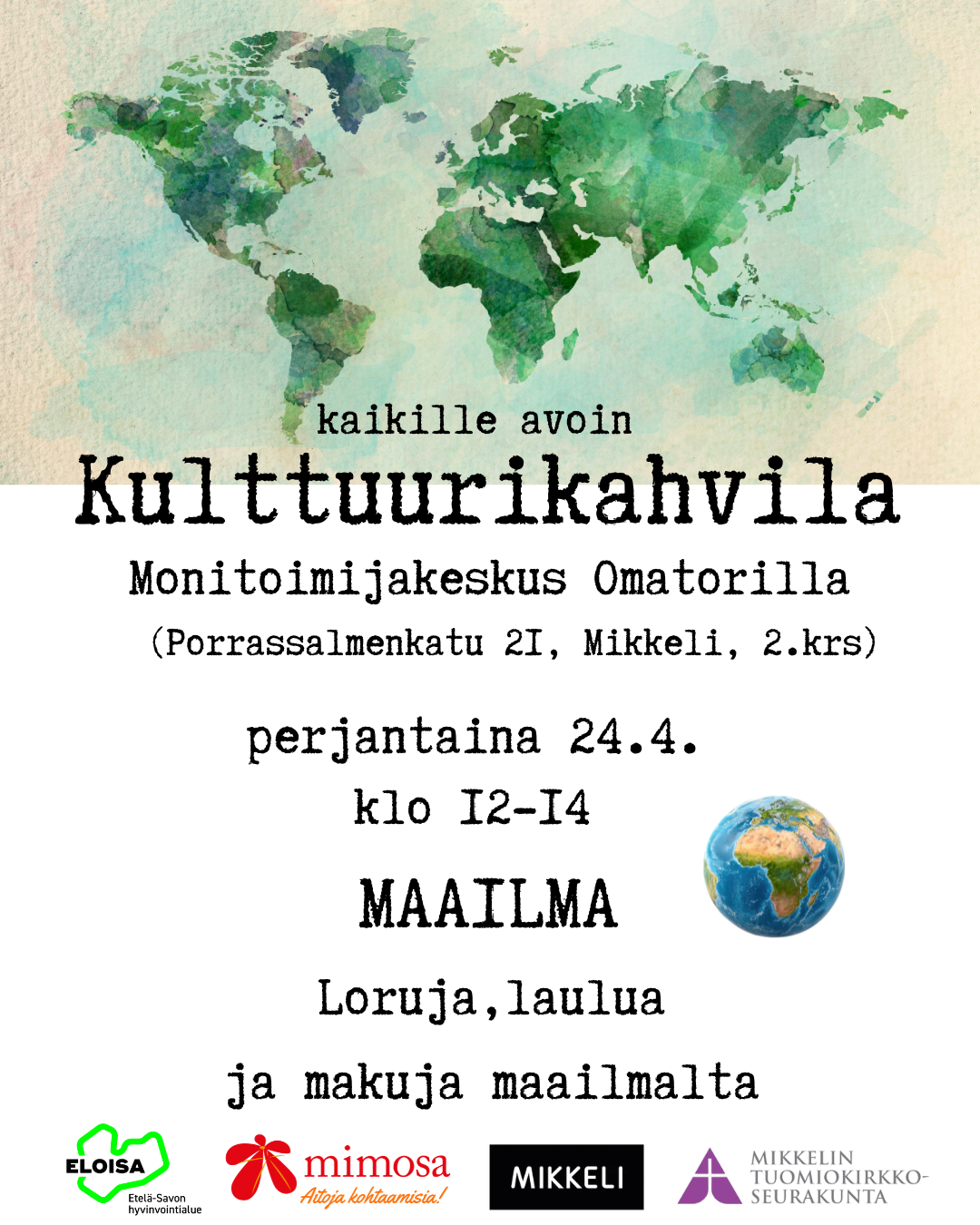 MAAILMA-teemainen Kulttuurikahvila Omatorilla pe 22.4. klo 12-14. Iltapäivän aikana kuulemme loruja ja lauluja maailmalta, ja pääsemme kahvin/teen kanssa maistelemaan herkkuja! Tule Sinäkin!