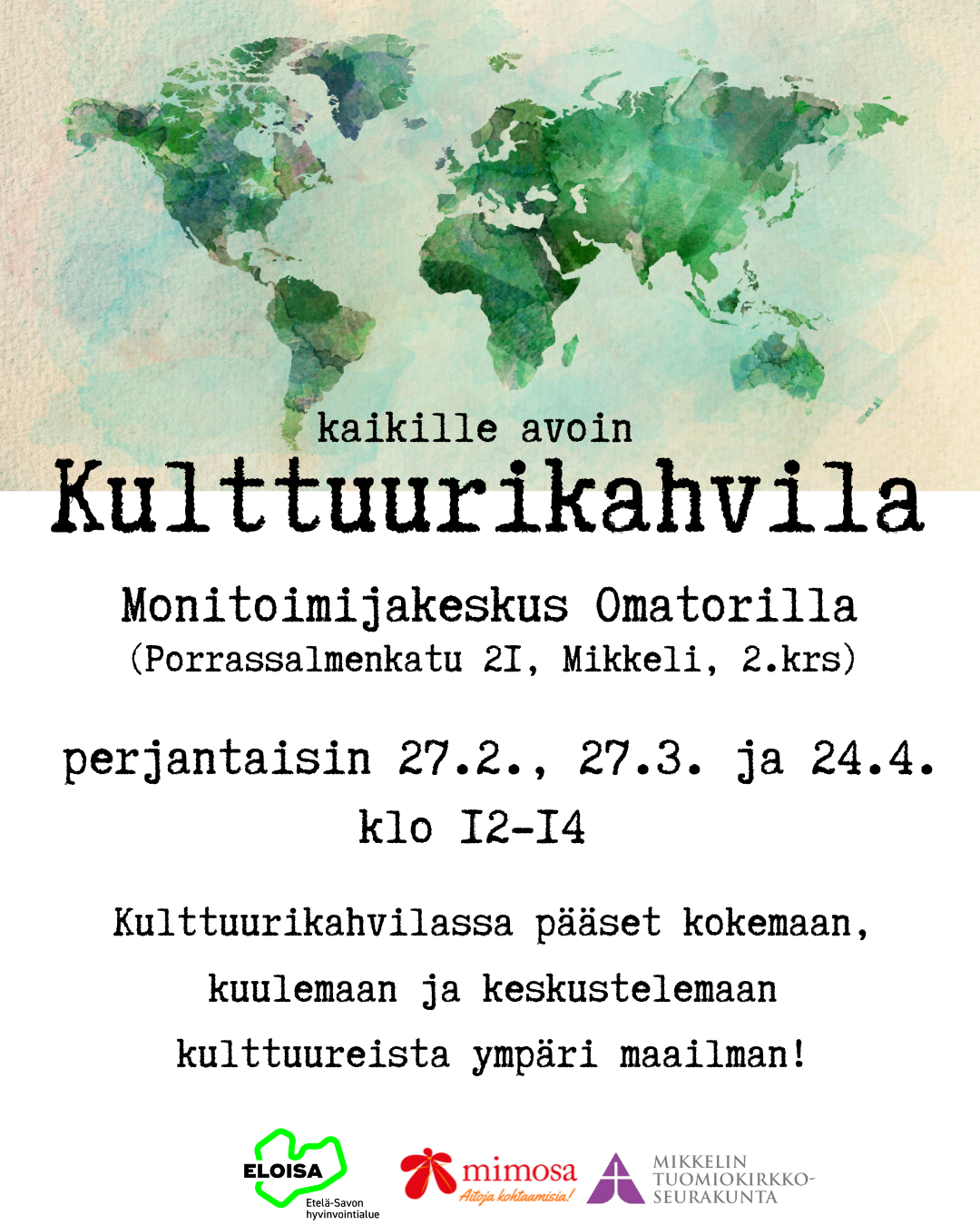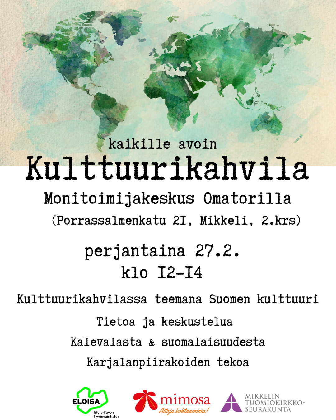 Kevään kulttuurikahviloissa vaihtuva teema. 27.2. Suomi, 27.3. Afganistan ja 24.4. Maailma. Lisätietoja erillisissä mainoksissa. Tule mukaan!