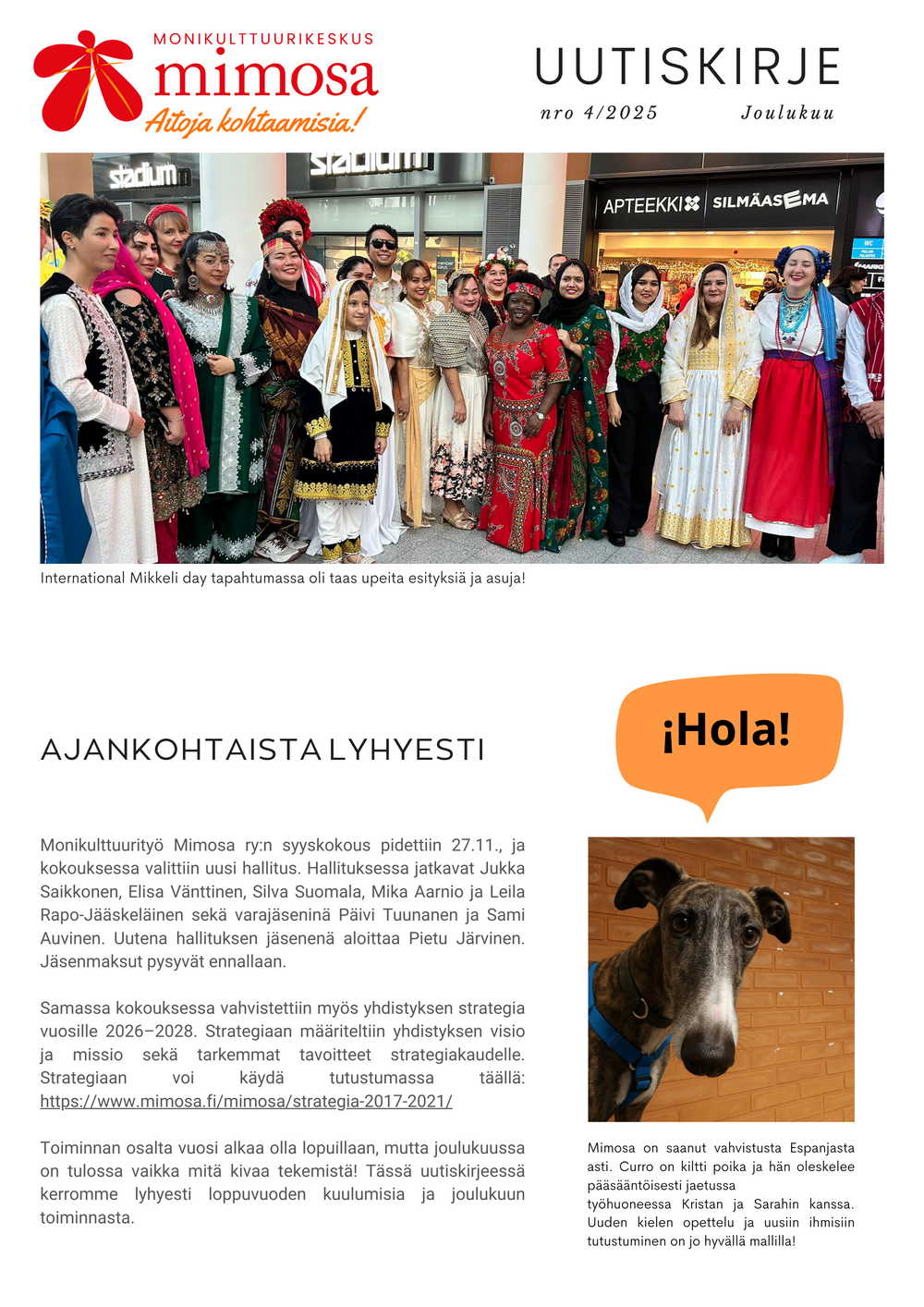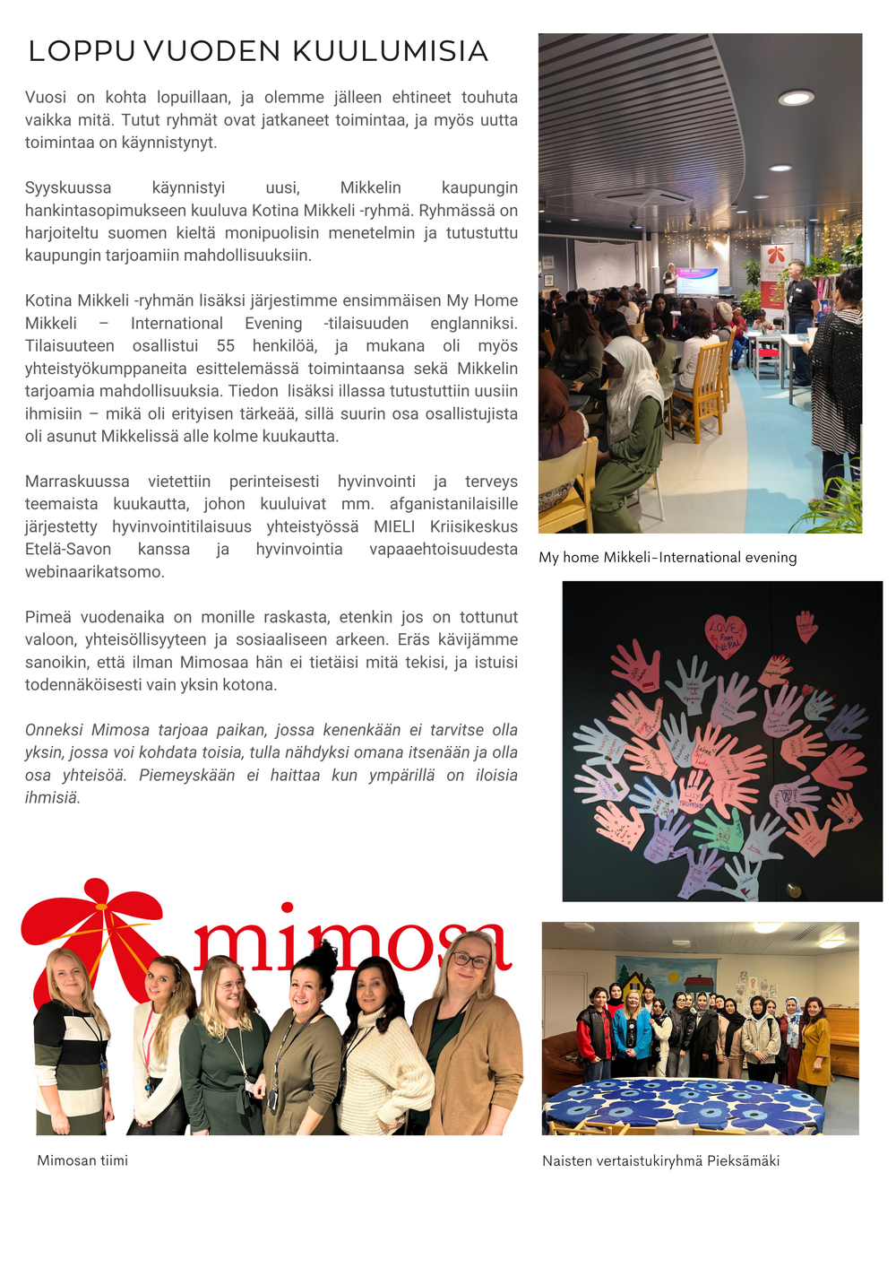 Ja Mimosan henkilökunta, Tuisku, Sigita ja Iris, olette aivan mahtavia! On ollut todella ilo tehdä töitä kanssanne.? Eikä yhteistyömme tähän lopu, sillä jatkanhan hallituksessa ja vapaaehtoisena Mimosassa.