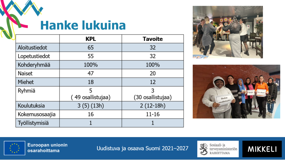Hankkeen aikana luotiin ja toteutettiin koulutuskokonaisuus, jossa koulutettiin kotoutumisen kokemusosaajia, ja perustettiin neljä uutta vertaistuellista ryhmää. Tavoitteena oli tukea alueella asuvien maahanmuuttajien kotoutumista, osallisuutta ja hyvinvointia sekä edistää yhdenvertaisuutta tuomalla Suomeen muualta muuttaneiden ääntä kuuluviin.